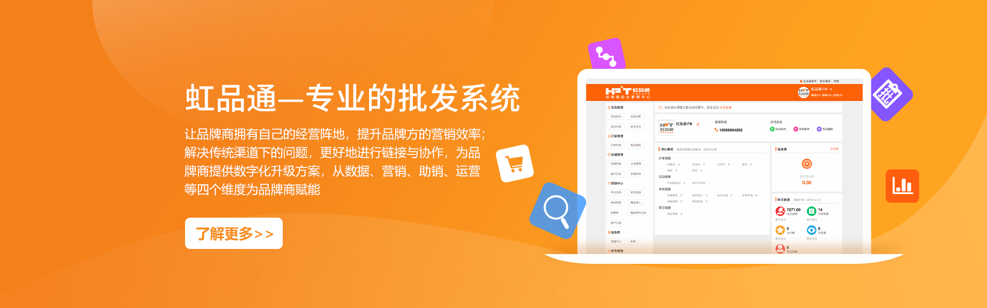 南寧虹品通軟件科技有限公司成立于2014年,是一家開發(fā)軟件技術服務公司。公司總部位于中國綠城南寧市,專注軟件行業系統支持和供應鏈大數據開發(fā),并將其應用于商業領域。掌握供應鏈系統研發(fā)、商品流通大數據、批發(fā)零售商城等核心技術,并持有多項技術專利和著作權。公司致力于幫助生產廠家、商品流通、銷售型企業向互聯網化轉型升級,利用互聯網獲取客戶、洞察市場、服務客戶